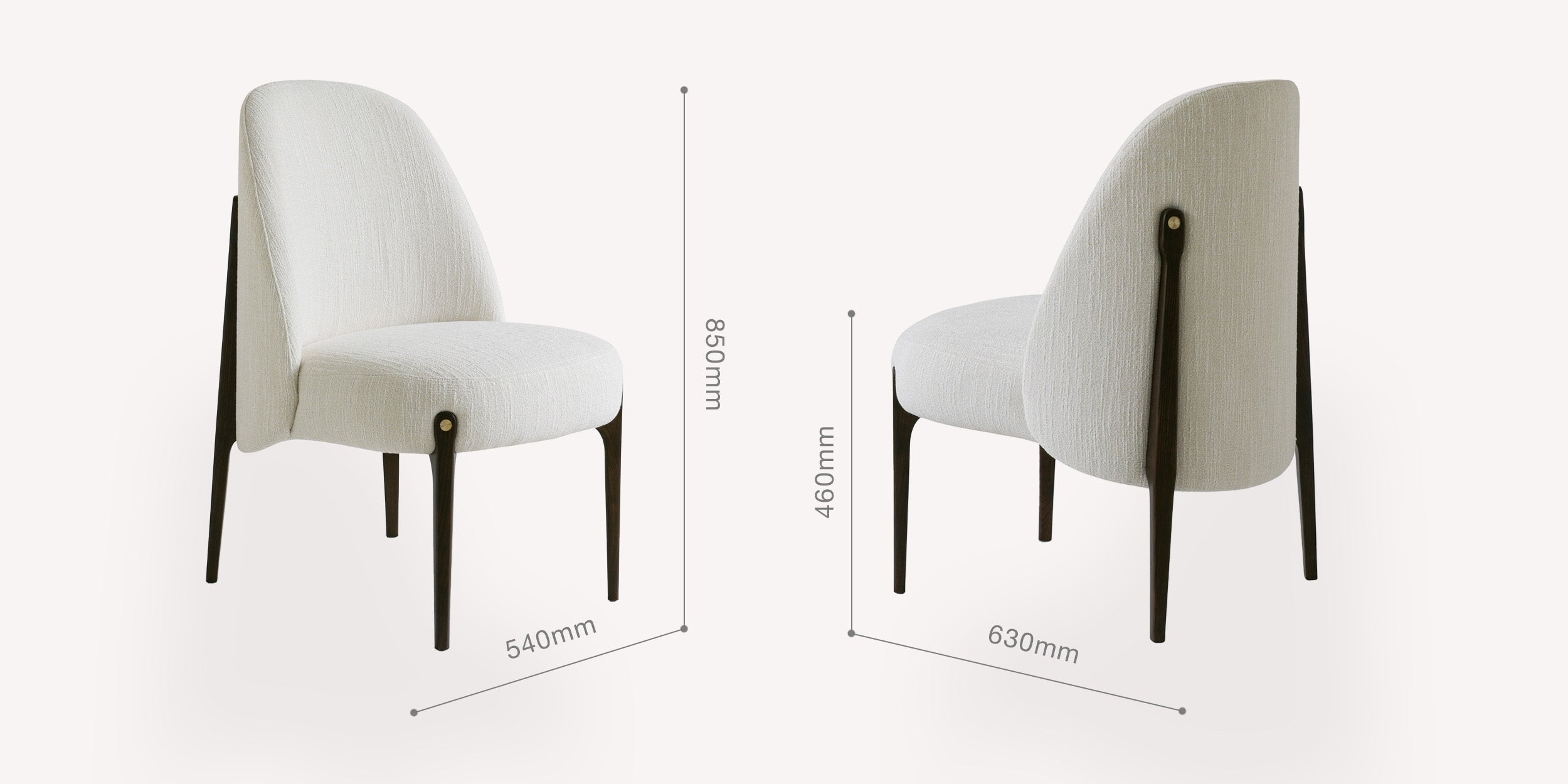 Premium chenille fabric embraces natural ash wood frame. Smoked ash wood legs combined with brass for elegance and detail. Being natural wood, each might differ slightly and have different grains and knots.