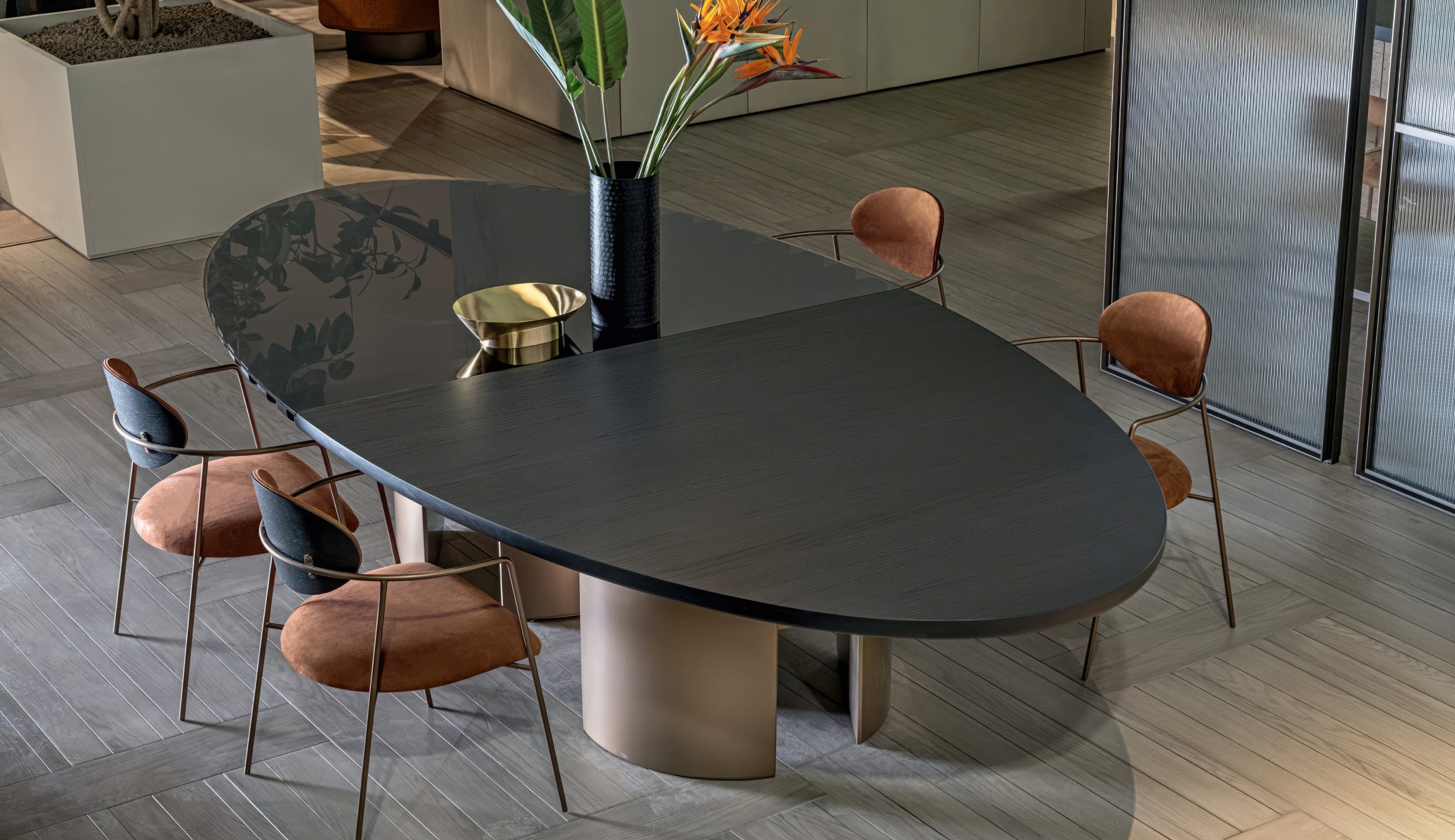 This fixed round table is not only a functional dining solution but also a statement piece that seamlessly blends contemporary style with classic materials, making it an ideal centerpiece for any dining area. The combination of dark bronze metal details and the rich wood finish creates a warm and inviting atmosphere.