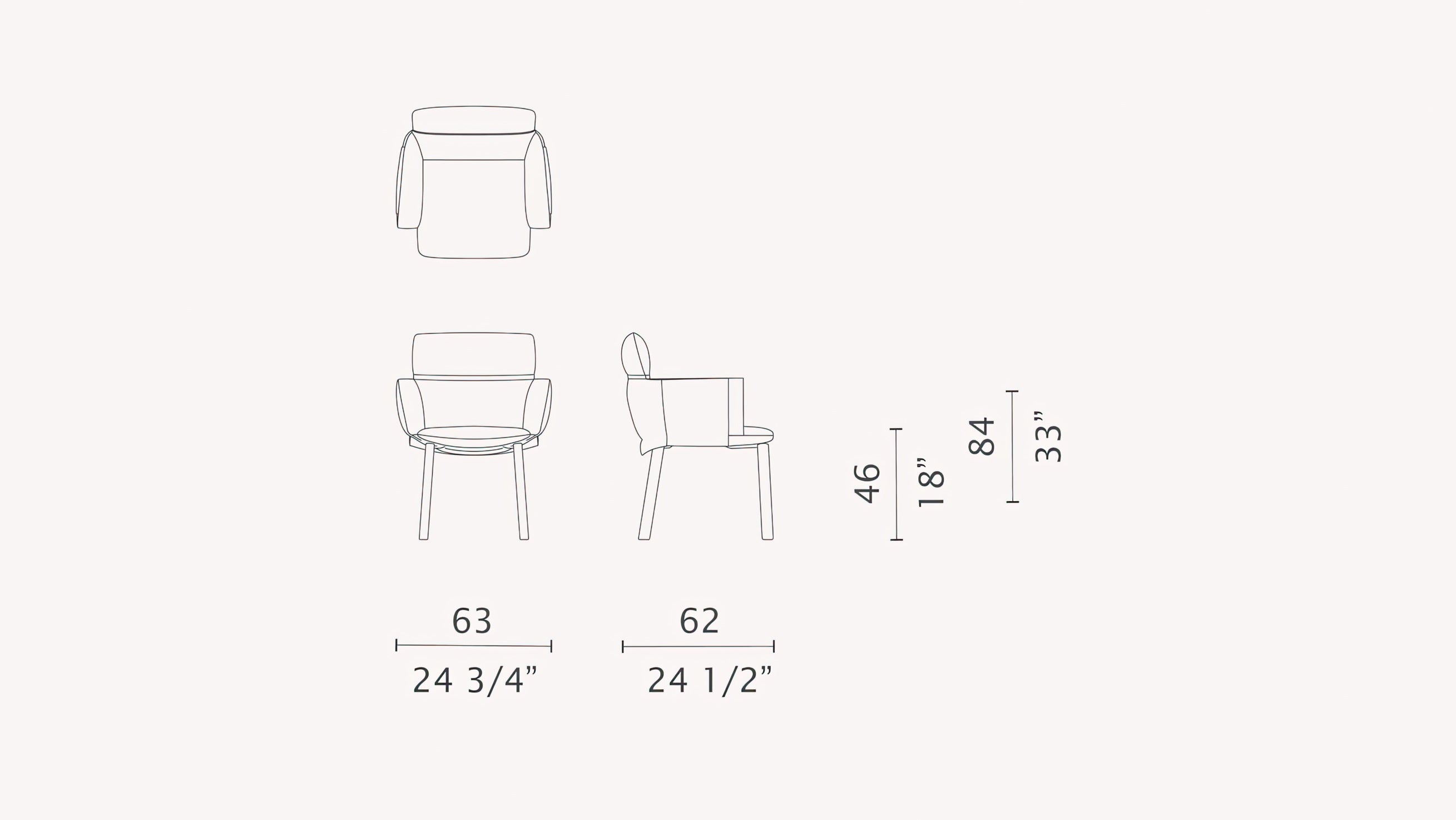 The chair features sturdy tubular legs in powder-coated metal or natural ash, a cushioned shell with premium down and foam, and removable covers in fine fabrics or leather.