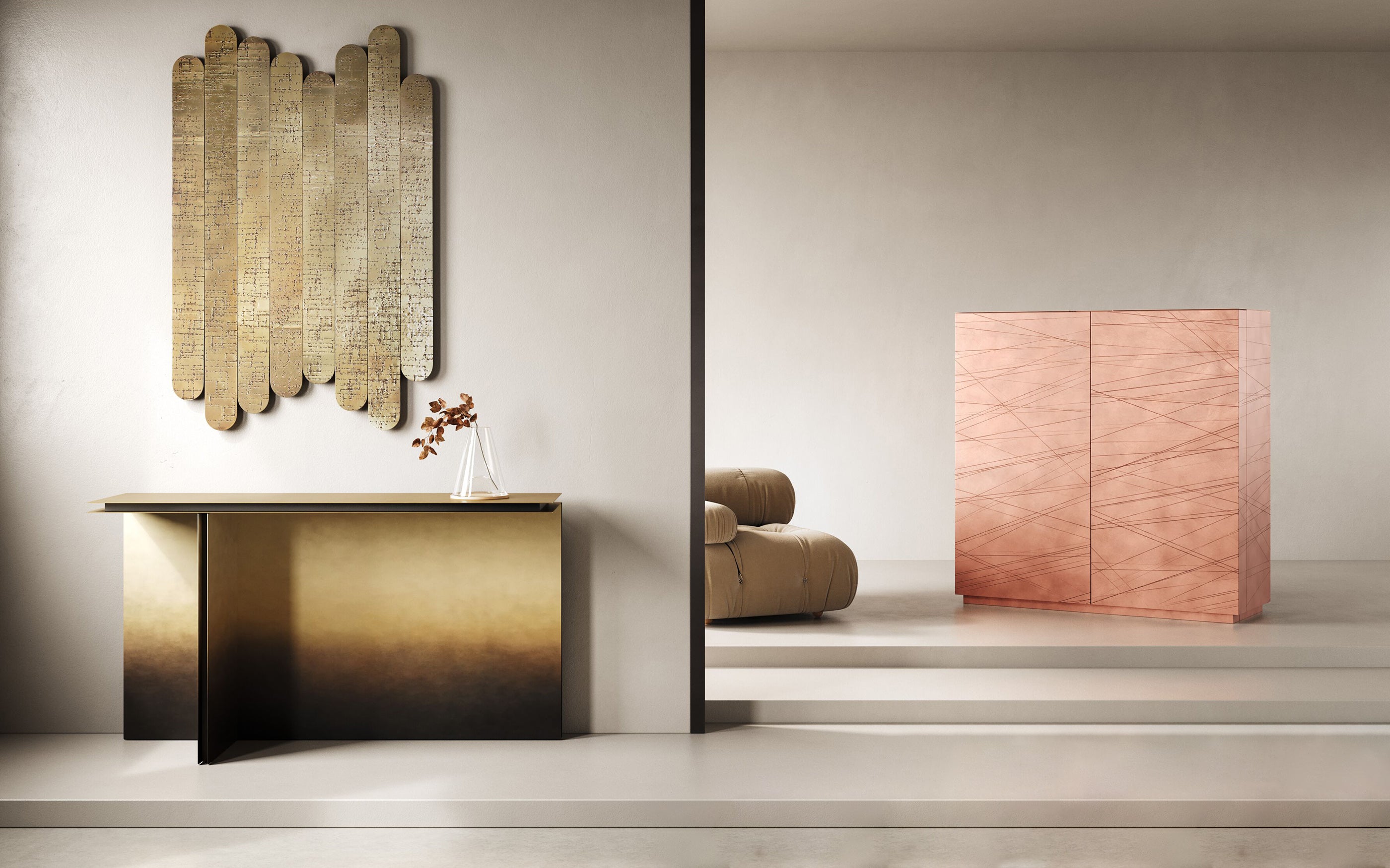 The Fil Console embodies pure, timeless elegance through slender metal planes and a minimalist form. With its bold, sculptural design, this piece brings a quiet strength to any space. Two parallel lines rise gracefully from the base, meeting the top’s horizontal edges to create a framework of geometric precision. Light and shadow interplay across the reflective surfaces, while the balance of solid and open spaces adds a refined rhythm to its silhouette. Crafted with thoughtful contrasts in materials and finishes, Fil Console is as striking as it is understated, seamlessly enhancing contemporary interiors.