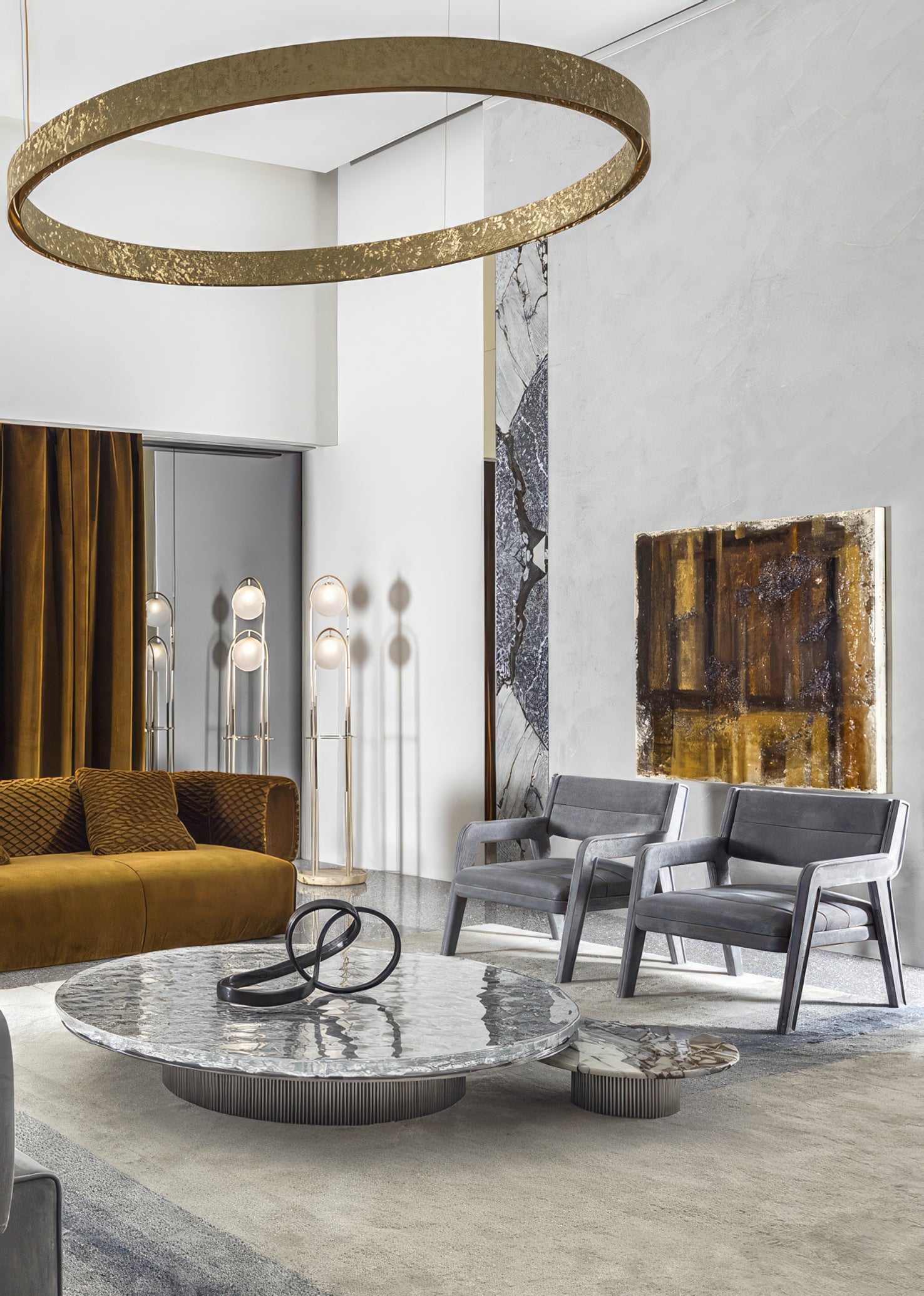 The glass top was born from the desire to experiment with a completely unconventional product, reinterpreting a millennial tradition in a modern key. The production difficulties inherent in a casting process aimed at obtaining a large and thick glass top, make this piece a truly unique element. The top is supported by a metal plate that accentuates the reflections of the lower part of the glass, resembling sea ripples. The cylindrical base consists of several thin metal rods connected to each other.