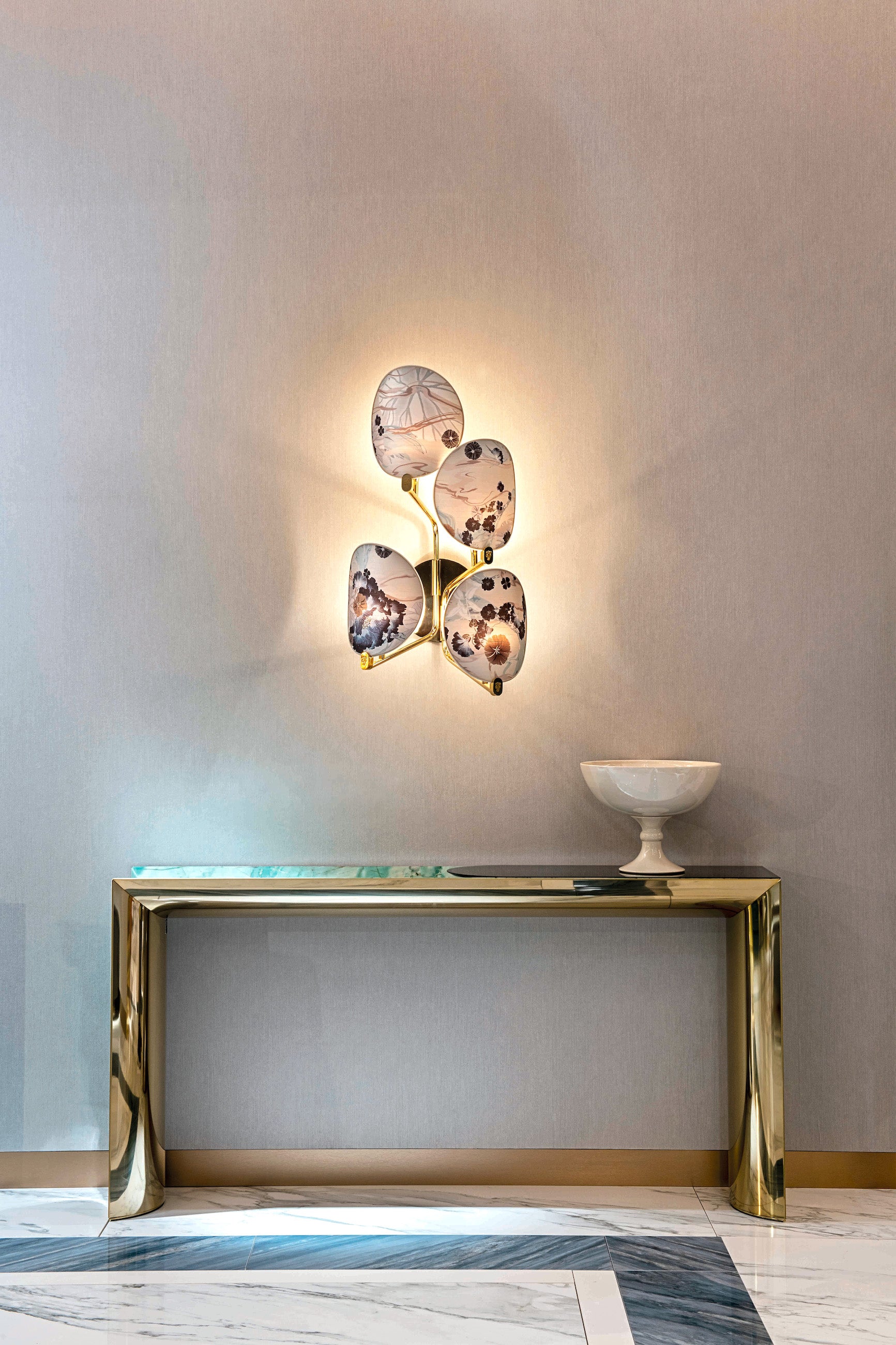 Kose console features a hand-polished concave marble top, which not only showcases the natural beauty of the stone but also provides a unique visual appeal. The table's frame is finished in a glossy gold lacquer, exuding a sense of luxury and sophistication. The innovative design includes curved polished stainless steel on the inner part, enhancing its structural integrity while adding a contemporary touch. Additionally, half of the upper surface is adorned with clear smoked glass, creating a striking contrast with the natural marble and allowing for versatile styling options.
