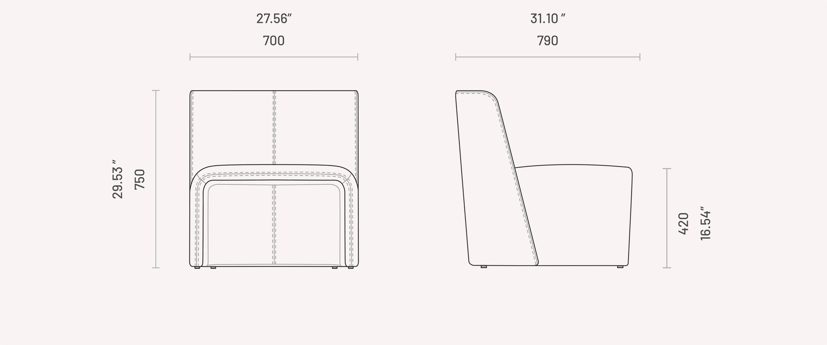 Its unique design forgoes traditional armrests, allowing the expansive backrest to flow effortlessly into the structure, creating a sleek and open silhouette. A single, refined stitched line runs gracefully down the center of the backrest, adding a subtle touch of detail that enhances its minimalist charm.