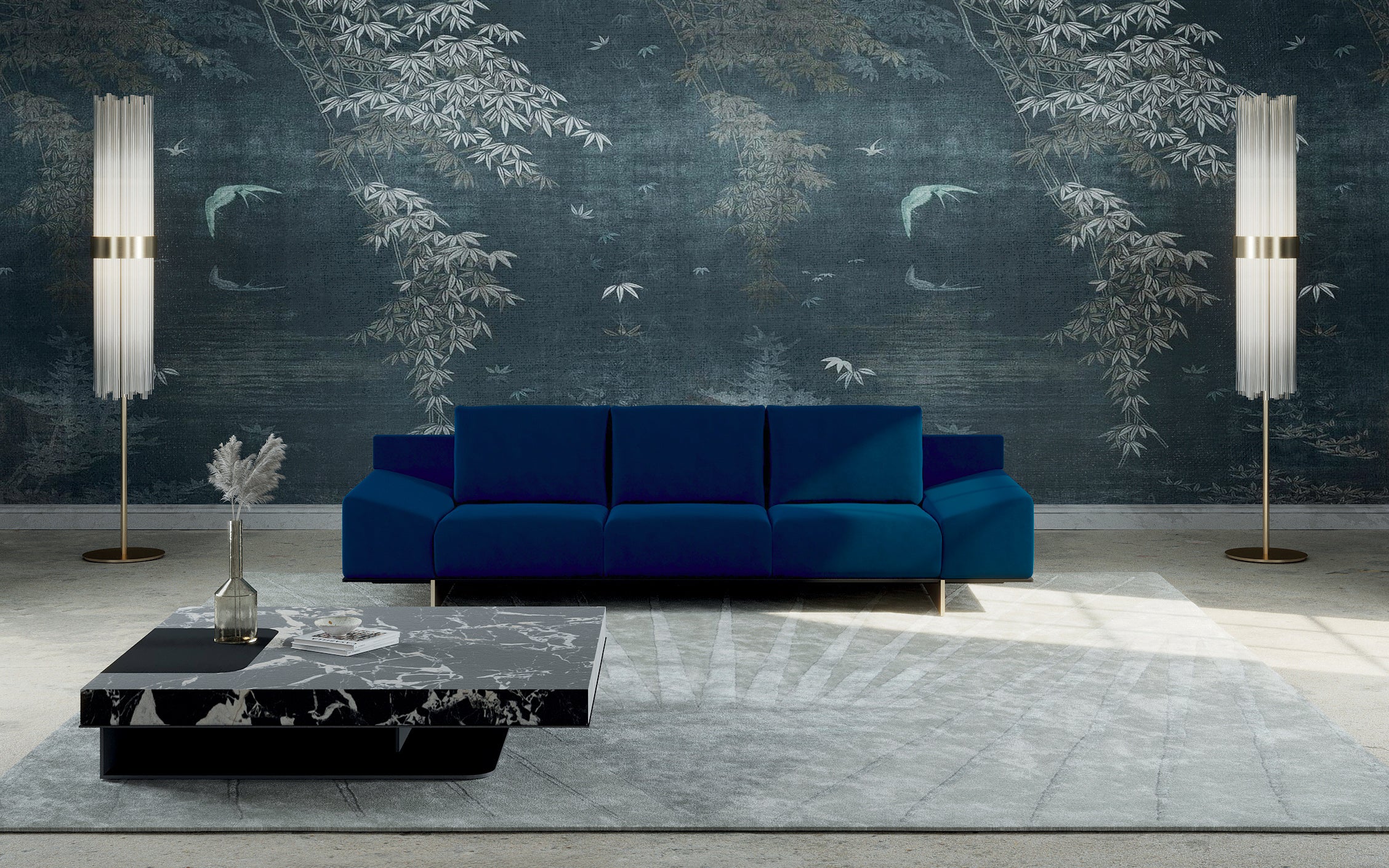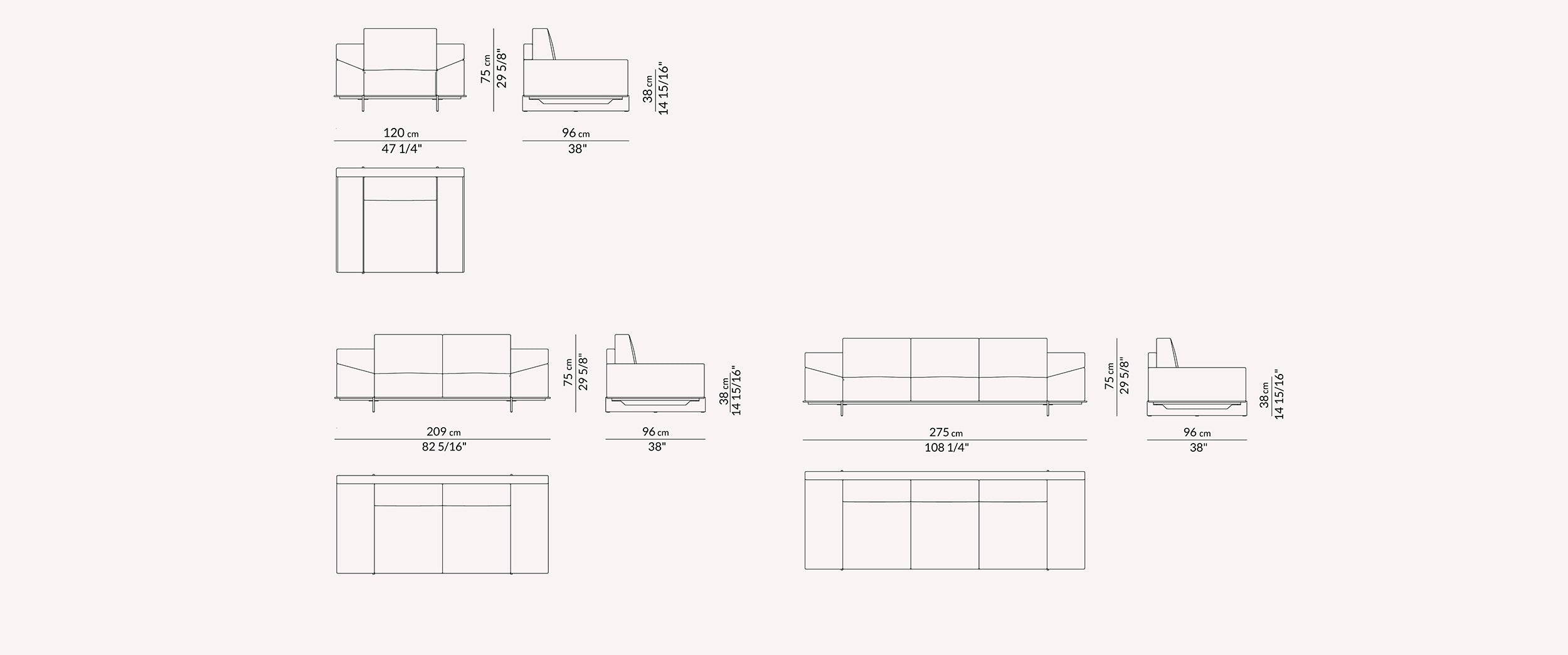 Made of a metal frame with matt black satin nickel finish and polished gold for the feet – contains full bodied cushions and soft seats made of polyester fiber with an insert in non-deformable material of different densities. The back cushions and the armrests are made of polyurethane with polyester fiber covering to ensure optimal support and be equally soft and welcoming. For extra comfort, the cushions also have additional sterilized goose down filling. All cushions and backrests are removable.