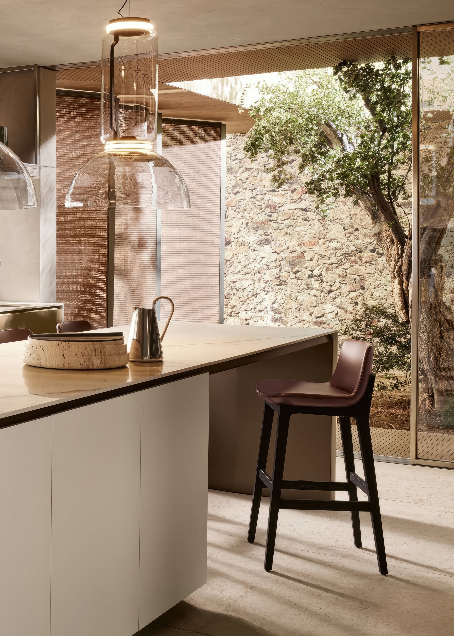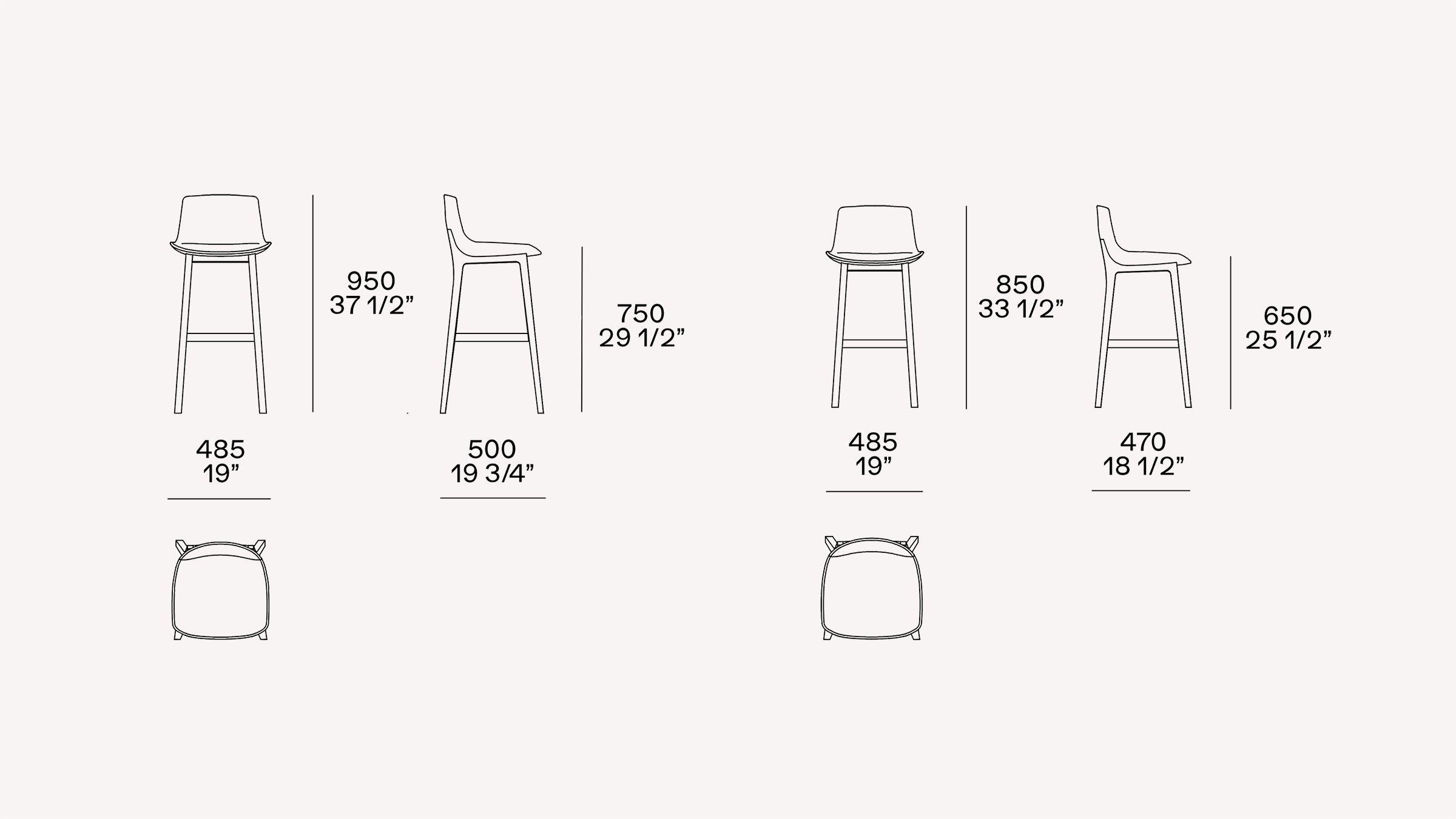 The T.01 bar stool is crafted with a solid ash frame that defines its sculptural presence. The seat is softly padded with high-density foam, offering comfort that feels effortless and refined. Each piece is upholstered in either fine fabric or non-removable leather, chosen for its tactile warmth and enduring beauty. The design balances strength with grace, where smooth curves meet clean lines in quiet harmony. The contrast between wood and upholstery creates a dialogue of texture and tone. Every surface invites touch, every proportion feels considered.