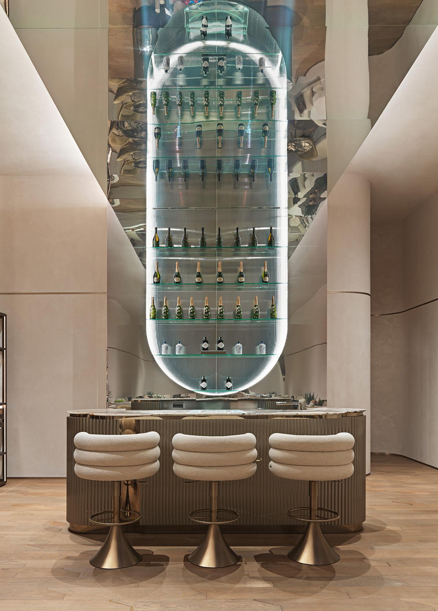 A standout feature is the distinctive backrest, made up of three individually upholstered cylindrical bands that showcase both craftsmanship and character. The rotating stainless steel base with a turned leg provides smooth movement, while metallic finishes add a refined and modern touch.